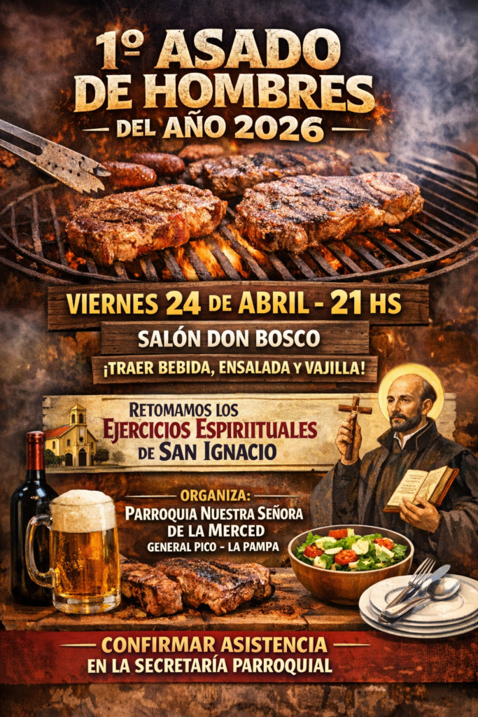 Ya se viene el primer ASADO DE HOMBRES AÑO 2026. Convocamos a todos los hombres de la comunidad que deseen participar. En cada encuentro, además del momento fraterno de compartir la mesa, la charla y el asado, tiene lugar la meditación de cada uno de los momentos de los Ejercicios Espirituales de San Ignacio de Loyola. En breve, compartimos algunas imágenes.