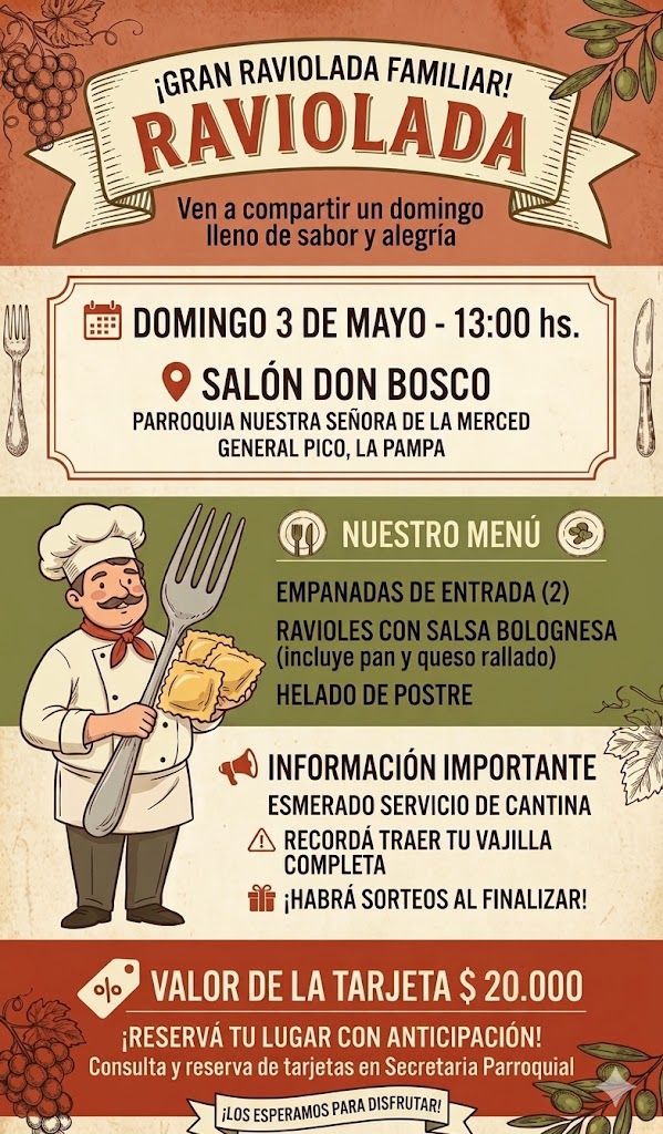 Están a la venta las tarjetas para participar de la RAVIOLADA FAMILIAR que organizada por el CONSEJO DE ASUNTOS ECONOMICOS de nuestra Parroquia se realizará el próximo Domingo 3 de Julio, en instalaciones del SALON DON BOSCO